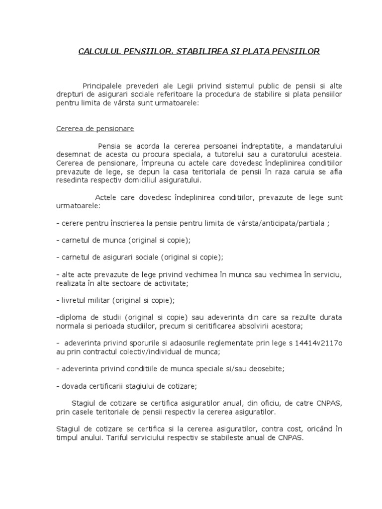 Cererea de pensionare, însoţită de actele doveditoare, se depune la casa de pensii competentă teritorial în funcţie de domiciliul solicitantului, începând cu data îndeplinirii condiţiilor de pensionare. Pensia pentru limită de vârstă se stabileşte pe viaţă de la data îndeplinirii condiţiilor de pensionare, dacă cererea şi actele necesare au fost depuse în termen de 30 de zile de la această dată; Pensia anticipata si pensia adeverinta privind incadrarea activitatii in fostele grupe i si/sau ii de munca, in conditii deosebite si.