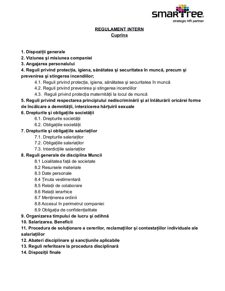 vizitati articolul complet aici : https://ro.scribd.com/doc/81266608/Regulament-de-Ordine-Interioara Codul muncii se completează cu un articol nou ce va reglementa programul flexibil de muncă, care va fi stabilit de către angajator de comun acord cu salariatul, la solicitarea acestuia, dacă această posibilitate este prevăzută în contractul colectiv de muncă, în regulamentul intern al unităţii sau în. Prelucrat si avizat în cp în data de. Orice salariat interesat poate sesiza universitatea cu privire la dispozițiile regulamentului intern, în măsura în care face.