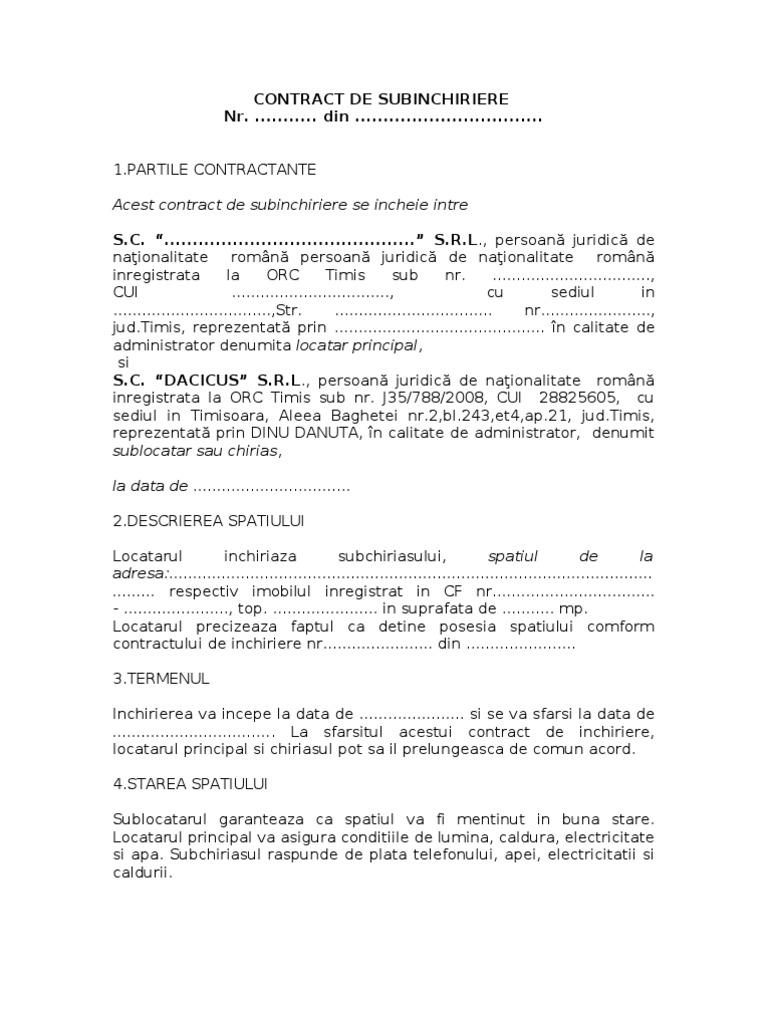 Puteți copia textul din pagină sau puteți descărca, de la sfârșitul articolului, fișiere.doc sau.pdf pentru imediata utilizare. Art.39 chiriaşul nu va face modificări bunului închiriat decât cu acordul scris al locatorului. Suma percepută pentru închirierea spaţiului este de.